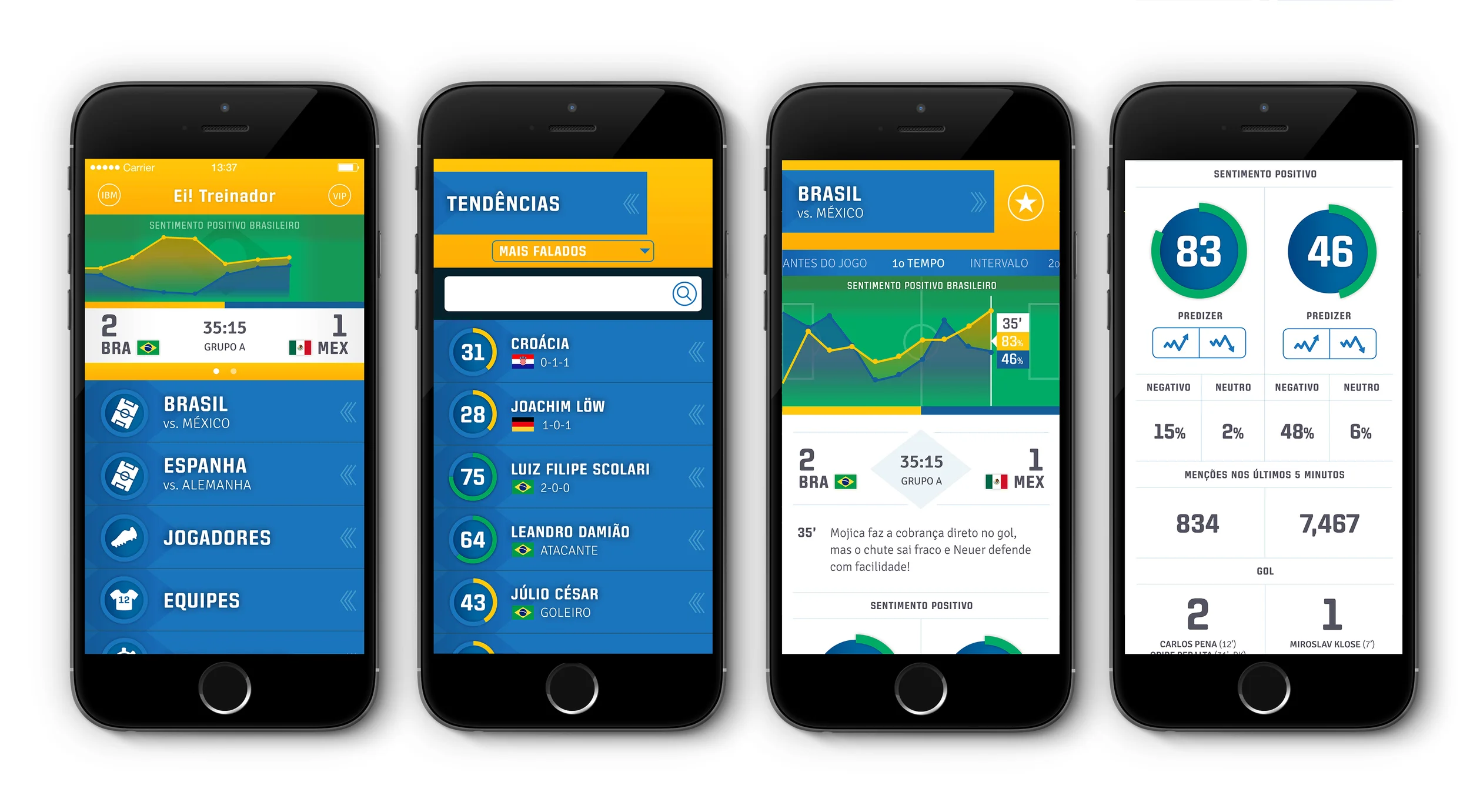 Ei! Treinador was a promotional app created at the IBM Mobile Innovation Lab for the 2014 FIFA World Cup in Brazil. Designed as a VIP experience for partners of IBM who were attending the games in person, Ei! leverages the IBM FAMA engine, which provides real-time sentiment through the parsing and analysis of tweets.